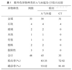 48例中确诊眼内异物43例。术前A与B超检查漏诊3例,出现假阳性5例,检出率83.33%(40/48);正确诊断40例,确诊率93.02%(40/43)。CT扫描漏诊8例,否认超声5例的假阳性图像,检出率为72.92%(35/48);正确诊断35例,确诊率81.40%(35/43)。综合分析双向检查图像,术前诊断眼内异物43例,与手术结果完全一致,诊断准确率提高至100%。A与B超对诊断的40例异物定位准确同手术所见一致,优于CT。CT对诊断的35例异物定性准确率均同手术所见一致。