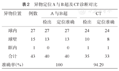 | 异物位置 | 例数 | A与B超 | CT | ||