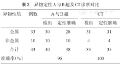 43例异物中金属异物33例(其中磁性23例、非磁性10例),非金属异物10例。术前A与B超检出的40例中,有2例包裹的小金属异物定性为非金属,定性准确率95%(38/40);CT检出的35例异物定性准确率100%(见表3)。