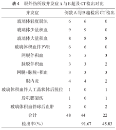 A与B超将1例玻璃体积血伴人工晶状体后脱位误诊为玻璃体积血伴球内金属异物,6例玻璃体积血伴PVR者CT只检出玻璃体积血,5例视网膜脱离伴玻璃体积血中2例局限性视网膜脱离CT未检出,3例脉络膜脱离伴玻璃体积血中1例隆起度不高的脉络膜脱离CT未检出。眼外伤48例中A与B超阳性符合率91.67%(44/48),CT阳性符合率45.83%(22/48)(见表4),A与B超准确率明显优于CT。