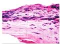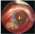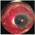 患者男,57岁。2014年1月于河南省立眼科医院就诊,1个月前,自觉左眼异物感,视力下降,并发现左眼泡样隆起物,来我院就诊。追问病史,患者30年前左眼曾被扫帚击伤,未行手术治疗,全身及局部应用药物治疗,视力稍有下降。本次入院检查:视力:右眼0.8,左眼0.1;眼压:右眼16 mmHg,左眼15 mmHg。左眼鼻下方球结膜可见巨大泡样隆起,壁薄,6点至9点位角巩膜缘处可见巩膜葡萄肿,余角膜透明,前房中深,瞳孔呈梨形,向鼻下方移位明显(图1)。左眼UBM检查角膜回声清晰,中央前房深2.4 mm,瞳孔向鼻侧移位,8点位角巩膜缘处连续性中断,断口直径约0.57 mm,缺损处上方少部分向前房内弯曲,对应处见巨大结膜滤过泡,与前房沟通,呈分叶状(图4)。左眼B超见玻璃体混浊。根据患者外伤史及检查所见,诊断为:左眼前巩膜葡萄肿伴巨大滤过泡,入院行异体巩膜移植术。手术方法:因滤过泡与前房沟通,为避免切开滤过泡时眼压骤降,先行前房穿刺,降低眼压,沿角膜缘剪开鼻下方球结膜,暴露巩膜葡萄肿,发现8点处角巩膜缘穿孔,虹膜嵌顿,与周围组织粘连较重,去除虹膜表面结膜上皮,回纳部分虹膜,板层剖切穿孔周围巩膜,取相应大小异体巩膜植片间断缝合于巩膜植床。术后第3天:球结膜充血水肿,角膜透明,前房中深,瞳孔不规则,直径约4 mm(图2)。复查UBM见左眼角膜回声清晰,中央前房深2.6 mm,角巩膜未探及低回声区(图5)。术后取剖切巩膜病理检查示:巩膜穿孔,可见虹膜组织粘连,符合葡萄肿改变(图3)。