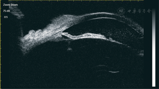 前巩膜葡萄肿多见于角巩膜缘的病变、深层巩膜炎、外伤、手术、慢性青光眼等[1,2]。本例患者30年前左眼曾受外伤,由于医疗条件受限,未治疗,患者自述受伤后发现视力下降,此后30年无变化。分析原因为外伤后已造成巩膜裂伤,随年龄增长,巩膜抗压性减弱及眼压的波动,房水漏出自发形成巨大结膜滤过泡[3]。有报道内眼手术后可出现滤过泡,也有人称为第二前房,滤过泡与前房沟通,却没有滤过功能[4]。本例术前采用UBM可清晰观察到8点位角巩膜缘处局部组织缺损,对应处可见巨大分叶状结膜滤过泡,与前房沟通。外伤后详细询问病史,并行详细眼科检查很重要,患者来我院就诊前,曾被多家医院诊断为结膜囊肿,结膜炎等,给予局部用药,延误病情,若按结膜囊肿给予单纯切除,则可导致严重后果。
