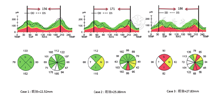 如图2所示,RNFL峰值分布角度与眼轴长度呈正相关的关系(r =0.349,P<0.001),与屈光度呈负相关关系(r =-0.272,P =0.003)。图3展示了3例健康近视眼OCT视盘扫描分析数据,随着眼轴的增长,RNFL峰值间距增大(峰值向颞侧偏移),RNFL分析报告趋于出现假阳性。
