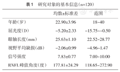 一共120只眼(120名参与者)纳入分析,其中男性58名,女性62名,57只右眼,63只左眼。研究对象的基本信息如表1所示,本组平均年龄为(22.90±3.96)岁,屈光度平均为(-5.20±2.33)D,眼轴平均长度为(25.63±1.10)mm,RNFL峰值分布角度平均为(182.18±24.29)度。