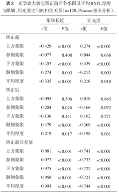 如表3所示,光学放大效应矫正前的平均RNFL厚度与眼轴长度呈负相关关系(r =-0.335,P<0.001),与屈光度呈正相关关系(r =0.216,P =0.018);矫正后的平均RNFL厚度与眼轴长度呈正相关关系(r =0.219,P =0.017),与屈光度呈负相关关系(r =-0.198,P =0.031)。