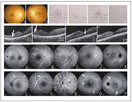 而在眼底光学影像学检查中,48例患者在FD-OCT检查中视野缺损对应部位均表现为视细胞内节/外节(IS/OS)反光带紊乱、变薄或缺失,伴视网膜色素上皮(RPE)层反光带紊乱(图E1-F1);但他们在FAF、FFA及ICGA检查上表现却不一致,主要分为两类。第一类患者28只眼,他们在FAF、FFA及ICGA检查中均无明显异常改变(图G-K)。第二类患者20只眼,他们在FAF检查中视盘周围和/或黄斑区可见斑点或斑片状增强的自发荧光灶分布。在FFA早期对应部位亦可见轻微或明显的斑片点状或斑片状强荧光,后期荧光进一步增强;其中有3例周边视网膜部分血管强荧光渗漏。在ICGA早期眼底无任何异常改变,但在晚期所有患者对应部位均出现了显著的低荧光;且这些异常荧光灶在分布上基本一致,与患者视野缺损区域也基本对应(图L-P)。
