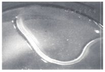 患者女,53岁。2015年6月25日因"右眼痒伴异物感1月"就诊。2个月前有飞虫入眼,1月后自觉右眼痒异物感不适。家养狗,且长期与其同床睡觉。2周前曾自己从右眼结膜囊内取出1条白色线状小虫。当地医院曾按"结膜炎"治疗,眼痒未见好转来我院就诊。门诊检查:双眼视力1.0;双眼眼睑、球结膜未见明显充血,裂隙灯下翻转右眼上睑,结膜囊上穹窿部颞侧可见白色透明线状虫体,游走活跃,或呈团状或结状(图1)。双眼前节及玻璃体眼底未见异常。1%丙美卡因右眼表面麻醉后,在裂隙灯下用眼科镊取出2条白色线状活虫体(图2)。生理盐水冲洗结膜囊后,再次反复检查双眼,未发现虫体。在光学显微镜下观察:虫体长10~12 mm,在生理盐水中保存4 h后活动(+),乳白色,线虫头端圆盾,体表有皱褶横纹。经华中科技大学同济医学院寄生虫教研室鉴定:2条均为眼结膜吸吮线虫(雄性及雌性各1条)。诊断:右眼结膜吸吮线虫病。给予左氧氟沙星眼液局部治疗。随访1月未复发。