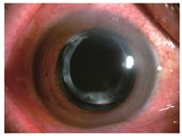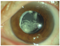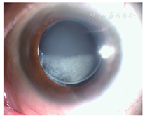 例1. 67岁,女性。左眼视力下降7月,于2012年1月就诊。患眼6年前行白内障超声乳化吸除IOL植入术(ACR6D SE,CORNEAL,单片一体型亲水性丙烯酸酯折叠IOL)。左眼视力0.2,眼压18 mmHg,散瞳验光:-2.00 DS→0.3-;IOL与后囊之间明显间隙,不均匀沉积物呈花瓣样结晶,界线清楚(图1),前节OCT示致密物质沉积于IOL与后囊间隙。行YAG激光后囊膜切开治疗,沉积物涌入玻璃体。一周后视力0.4,眼压19 mmHg,散瞳验光-0.00 DS+0.75 DC×165°→0.5;后囊沉积物消失。