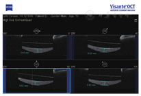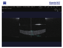例2. 61岁,男性。右眼视力下降1月,于2012年2月就诊。患眼8年前行白内障超声乳化吸除IOL植入术(ACR6D SE,CORNEAL,亲水性丙烯酸酯IOL),右眼视力0.5,眼压16 mmHg,散瞳验光:-0.5 DS-0.75 DC×85°→0.8;可见IOL后表面与后囊间存在间隙,乳白色物质均匀沉积,前节OCT示较致密物质沉积于IOL与后囊间隙(图2)。行YAG激光周边前囊膜切开及后囊膜切开术,混浊物质从前囊口溢出,团块状浑浊物沉于前部玻璃体。一周后视力0.8,眼压16 mmHg,散瞳验光:-1.00 DC×85°→0.8,仅存极少量沉积物。