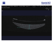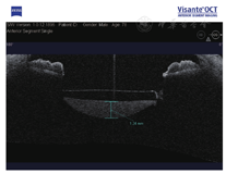 例4. 78岁,男性。左眼视力下降3月,于2012年4月就诊。患眼10年前行白内障超声乳化吸除IOL植入术(MA60BM,Acrysof疏水性丙烯酸酯IOL)。左眼视力0.2,眼压14 mmHg,散瞳验光:-2.50 DS+1.25 DC×85°→0.2;IOL后表面与后囊间乳白色物质沉积,前节OCT示较致密物质沉积于IOL与后囊间隙(图4)。行YAG激光周边前囊膜切开及后囊膜切开术,泡沫状混浊物质从前囊口及后囊溢出。一周后视力0.3,眼压14 mmHg,散瞳验光:-0.50 DS+1.00 DC×180°→0.4,沉积物消失。
