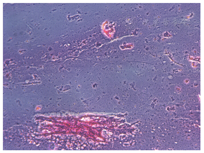 例6. 78岁,男性。左眼视物模糊3月,于2012年6月就诊。左眼10年前行白内障超声乳化吸除术及IOL植入术(MA60BM,Acrysof疏水性丙烯酸酯IOL)。左眼视力0.5,眼压17 mmHg,散瞳验光-1.50 DS→0.5;见灰白色颗粒状物质沉积于后囊膜与IOL后表面之间,形成一整齐液平面(图6A),前节OCT显示较致密物质沉积于IOL与后囊间隙(图6B)。行囊袋积液抽吸术(图6C),抽出不足0.1 ml的后囊积液,行HE染色,显微镜下观察为均质粉染物质,无明显细胞或组织结构,为蛋白渗出物(图6D,leica倒置相差显微镜,10X10)。术后一周视力0.7-2,眼压12 mmHg,散瞳验光-0.25 DS-1.25 DC×145°→0.8,后囊沉积物消失。