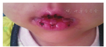 患儿女性,5岁。因无明显诱因间断发热、咳嗽7天,加重伴喘息3天,于2015年10月20日入吉林大学白求恩第一医院儿科。入院7天前,患儿体温最高达38℃,口服退热药可降至正常,一日发热2~3次,阵发性咳嗽,自行口服"小儿氨酚黄那敏颗粒"。服药4天后,咳嗽加重,伴有喘息。入院2天前,患儿双侧结膜充血、分泌物增多,口腔出现疱疹,伴有破溃。入院时患儿及家属自述患病以来饮食差。入院查体:一般状态及精神尚可,表情痛苦,无明显发绀,三凹征阳性,双眼结膜充血,分泌物较多,口腔疱疹,大部分已破溃,双手掌心可见红色皮疹,伴有轻度瘙痒,躯干、脚心及肛周未见皮疹,咽充血,双肺呼吸音粗,可闻及中小水泡音及喘鸣音。皮肤科专科检查示:口唇,口腔黏膜、糜烂(见图1),面部、四肢散在红斑、水疱。患儿双眼眼睑皮肤发红,双眼球结膜充血。经儿科治疗患儿全身状态好转后,转入我院眼科。