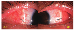 Stevens-Johnson综合征即重症渗出性多形性红斑,简称SJS,是累及皮肤和黏膜的急性水疱性病变,常发生在感染或全身局部应用药物后[1]。目前有研究表明,SJS的病因主要集中在感染引起的自身免疫反应、药物导致的细胞和HLA-B*1502基因相关性方面[2]。SJS的发病与免疫复合物沉积在真皮和结膜实质中有关。部分药物如氨苯磺胺、抗惊厥药、水杨酸盐、青霉素、氨苄西林和异烟肼,或单纯疱疹病毒、金黄色葡萄球菌、腺病毒感染可诱发此病。患者主诉有眼痛、刺激、分泌物和畏光等。双眼结膜受累。最初表现为黏液脓性结膜炎和浅层巩膜炎,晚期瘢痕形成导致结膜皱缩、倒睫和泪液缺乏。继发角膜血管瘢痕化后影响视力[3]。该病的特征是黏膜和皮肤的多形性红斑,国外报告白种人多发,发病年龄大部分在10~40岁[4]。SJS发生率极低,White报道每年在美国有3 834例可证实的SJS发生,发生率为12.35/100万,根据美国发生的数据,每年全世界有357 710例SJS发生[5]。目前国内尚无小于5岁儿童患者的报道。
