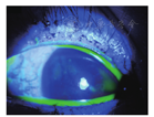眼科专科查体:双眼睑红肿,睑缘破溃,结膜充血、水肿,伪膜形成,颞侧结膜皱缩。结膜囊内可见黄白色分泌物;角膜透明,余未见明显异常(见图2)。BUT:不能形成泪膜。右眼颞侧结膜着染。右眼角膜可见大片点状着染(见图3)。诊断为:(1)重症多形性红斑型药疹,(2)Stevens-Johnson综合征。治疗:给予甲强龙60 mg静点,左氧氟沙星水8次·d-1,自体血清(患儿家长血液提取)6次·d-1,氟米龙4次·d-1,玻璃酸钠滴眼液6次·d-1,除伪膜、冲洗结膜囊1次·d-1。治疗1周后患者查体:双眼眼睑肿胀较前减轻,结膜充血较前减轻,结膜囊内分泌物明显减少。治疗30天后查体:双眼轻度条索状睑球粘连,双眼下睑略红,面部、四肢水泡已消退,可见淡红色皮疹瘢痕,口唇糜烂基本愈合。