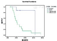 本研究中,行肿瘤局部切除或扩大的局部切除+术后放疗患者16例,行眶内容摘除+术后放疗患者10例(见表4)。肿瘤局部切除或扩大的局部切除+术后放疗组患者的平均生存时间38.93个月,眶内容摘除+术后放疗组患者则为30.56个月,两组间生存时间差异无统计学意义(P>0.05)(图3)。