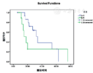 本组病例依据最新第七版美国癌症联合委员会对泪腺区腺样囊性癌分级:T1期2例(7.69%),T2期3例(11.54%),T3期2例(7.69%),T4期19例(73.07%);T4期组患者平均生存时间22.16个月,T1~T3期组患者则为65.63个月,可见T4期组患者的生存时间较T1~T3期组短(P<0.05)(图1)。