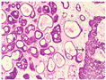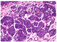 本研究中,实体型17例,占65.38%;混合型7例,占26.92%;管状型及筛状型各1例,各占3.85%(图4,图5,图6,图7)。从平均生存时间角度比较,实体型组患者26.83个月,非实体型组57.63个月,实体型组患者生存时间较非实体型组短(P<0.05),见图2。