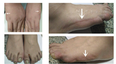 患者男,22岁。因双眼视力下降伴夜盲6年余,于2017年10月27日来我院就诊。患者自幼肥胖,智力低下。中专学历,辍学在家,目前无固定职业。追问病史,患者出生时双手、双脚均为6指(趾),于2周岁时在当地医院经手术切除第6指(趾)。11周岁时发现左侧隐睾,同年在当地医院进行手术治疗。父母非近亲结婚,患儿为独生子女,足月产,否认吸氧史、家族史。体格检查:体态肥胖,身高175 cm,体重90 kg,体重指数为29.39 kg/m2(正常值为18.5~24.99 kg/m2)。双手指、足趾粗短,外侧均可见长约5 cm手术瘢痕(图1)。心肺无异常,阴茎、睾丸均较同龄人小。