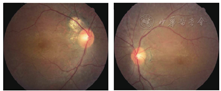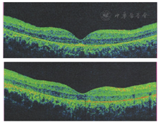 眼科检查:视力:右眼0.05(矫正视力不提高);左眼0.05(矫正视力0.1);散瞳验光:右眼-3.25 DS+0.75 DC×30=0.05;左眼-2.00 DS+0.50 DC×120=0.1;眼压:右眼17.4 mmHg;左眼18.7 mmHg;右眼外斜约15°,未见眼球震颤;双眼睑球结膜无充血;角膜清;前房中深;角膜下沉积物(-);房水闪光(+);双瞳孔等大等圆,直径3 mm左右,直接间接对光反射(+);双眼晶状体透明;双眼玻璃体透明。眼底检查:双眼视乳头颜色蜡黄,杯盘比为0.3,可见视乳头周围萎缩斑;全视网膜血管纤细;周边部视网膜可见散在骨细胞样色素沉着;黄斑中心凹光反射可见(图2)。相干光断层扫描(OCT)检查示:脉络膜、视网膜色素上皮层萎缩,神经上皮层薄变、结构欠清,中心凹视网膜层次损失较旁中心凹部分明显(图3)。荧光素血管造影(FFA)检查示:双眼静脉期可见全视网膜血管纤细,后级部至中周弥漫强荧光点,其间点状色素性荧光遮蔽;黄斑拱环边界欠清。晚期后极强荧光着染(图4)。