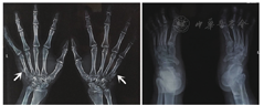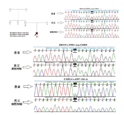 实验室检查:血、尿常规,肝、肾功能和血糖均在正常范围内。染色体检查结果,正常核型,46XY。双手双足X线(正侧位),双手第五掌骨近端尺侧骨性突起;双足跗跖关节面骨质形态欠自然,足趾走行欠佳(图5)。遗传学检测,患者携带3种杂合突变:(1)BBS10 c.602G>A;p.C201Y;(2)BBS10 c.539G>A;p.G180E;(3)USH2A c.4397-1G>A。家族史,其父携带杂合突变1(图6)。诊断:双眼Bardet-Biedl综合征。
