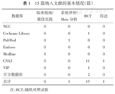 3.检索结果。剔除重复文献,并仔细阅读文题、摘要和全文进行筛选,最终纳入Meta分析1篇,RCT 15篇,综述1篇,见表1。