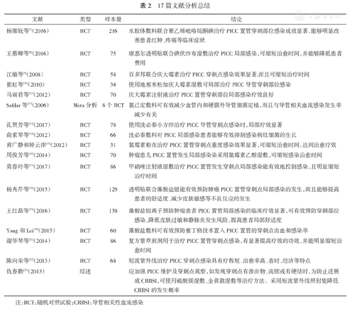 | 孔贺芳等[13](2017) | RCT | 78 | 使用洗必泰小方纱治疗PICC导管穿刺点感染时,局部疗效显著 |