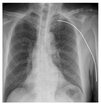 患者,男,64岁,诊断为前列腺癌,既往有高血压、糖尿病病史。入院实验室检查:血常规正常,D-二聚体620 μg/L。2018年3月29日因化疗需要右上臂贵要静脉在超声引导下置入非三向瓣膜单腔4 F PICC(美国昊朗优力捷导管),穿刺、送管均1次成功,导管置入体内45 cm,胸部X线片显示导管尖端位于上腔静脉下段,气管隆突下1椎体。导管留置期间,患者在本院共接受6次静脉化疗(泰素帝、地塞米松联合用药),每次输液前回抽血液通畅,未发现导管内血栓,输液结束10 ml氯化钠注射液脉冲冲管,2 ml肝素氯化钠溶液(浓度10 U/ml)正压封管。治疗间歇期患者在当地医院每7天维护一次,未发生异常情况。2018年8月3日患者完成最后一次化疗,遵医嘱拔管,导管体内留置129 d。护士严格遵守PICC拔管操作流程。拔管初始无阻力,拔出15 cm时突然阻力增大,停止拔管动作,导管回弹,回抽血液通畅,冲洗通畅。胸部X线片显示导管走形及尖端位置见图1。