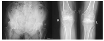 6.功能康复锻炼。术后功能康复锻炼是关节置换治疗血友病性关节炎的重要组成部分,是改善关节功能、提高生命质量的重要途径[24],由于血友病患者常常关节周围肌肉挛缩、关节畸形,功能康复锻炼难度大[25],功能康复锻炼须在康复师的指导下进行,并遵循个性化和循序渐进的原则[7]。对于无抑制物的血友病A型血友病性关节炎患者术后功能锻炼的时机,专家共识[7]推荐在术后24 h开始,锻炼应在凝血因子替代治疗保护下进行,高娜等[26]认为输注凝血因子后6 h内凝血因子活性在40%以上,这一阶段是功能锻炼的安全期,据此我们制订了个性化的三阶段康复锻炼计划。(1)早期训练(术当日):手术当日患者麻醉完全消退后为患者按摩股四头肌和腓肠肌,指导患者活动双侧足趾及踝关节,并抬臀每2小时1次;术后6 h抬高床头,指导患者行踝泵运动,以及深呼吸、咳嗽训练。(2)中期训练(手术次日至1周):术后次日晨查凝血Ⅷ因子活性(FⅧ:C)为116.5%,继续上述训练,膝部引流管拔除后指导行患肢股四头肌等长收缩训练,健肢等张收缩训练等肌力训练,上述训练项目10次/组,10组/d,通过训练促进血液循环,预防静脉血栓的形成,同时可避免肌肉萎缩,利于关节功能恢复;术后48 h髋部引流管拔除后指导继续上述训练的同时行臀肌等长收缩训练,10次/组,10组/d,利于预防肌肉萎缩;术后第4天晨查凝血Ⅷ因子活性(FⅧ:C)为91.6%。指导患者在床上做髋、膝关节主动屈伸锻炼,并按摩下肢肌肉3~4次/d,目的是提高肌力,为离床活动及负重奠定基础;术后5 d开始指导患者进行上下床、离床坐及站立等体位转移练习。离床坐30 min后扶助行器辅助站立3 min,患者感觉无头晕、恶心,扶助行器在病房内缓步行走5 m,此后逐渐延长离床坐、站立时间,加大行走距离。(3)后期训练(术后第2周开始):持续监测凝血Ⅷ因子活性在45%~65%。继续股四头肌、踝泵及髋膝关节的主动屈曲训练,重点进行助行器辅助站立、拄拐行走及步态训练。在康复师的指导下,经过上述三阶段康复锻炼,患者术后18 d时能独立坐起,可扶助行器下床活动;术后第32天影像学检查人工髋、膝关节位置良好,于术后第34天出院。