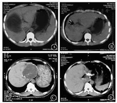 A:CE3a型包虫病穿刺前CT影像图;B:CE3a型包虫病穿刺后负压引流CT影像图;C:CE4型包虫病穿刺前CT影像图;D:CE4型包虫病穿刺后负压引流CT影像图;CE:囊型包虫病