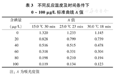 0~ 100、0~ 400和0~ 800 μg/L不同含碘量范围的标准曲线检测结果见表2,回归方程相关系数(r)分别为-1.000 0、-0.999 9、-0.999 8。分别平行测定不同含碘量范围标准曲线0管各12份次,得到A值分别为1.238 ± 0.003、1.659 ± 0.004、1.736 ± 0.005,方法检测限分别对应为0.3(取样量为0.80 ml)、1.2(取样量为0.20 ml)、2.2 μg/L(取样量为0.10 ml)。在不同反应温度及时间条件下测得0~ 100 μg/L标准曲线各点的A值见表3,回归方程r值分别为-0.999 9、-1.000 0、-1.000 0。