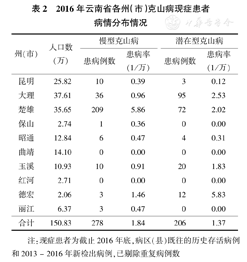 截止2016年底,云南省现症克山病患者484例,患病率为3.21/万。慢型克山病患病率(1.84/万)高于潜在型患病率(1.37/万),其中慢型克山病患病率以楚雄州最高,云南省最早发现的克山病病例就是在楚雄州,并被命名为"楚心病";楚雄州是云南省克山病历史重病区,现症慢型克山病患者较多。有研究表明,硒营养的加强可以增加心肌营养,改善心肌代谢,减少心肌损害[5]。2002-2007年,在全省病区范围内采取口服亚硒酸钠片措施,部分地区开始食用硒碘盐,使得近年来云南省克山病病情处于平稳低发态势,自2003年后几乎未见急型、亚急型克山病病例。