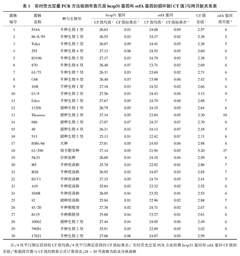 注:a4次平行测定获得的CT值均值;b4次平行测定获得的CT值标准差;c实时荧光定量PCR方法检测bcsp31基因和orfA基因CT值的差值;d根据拷贝数与CT值的换算公式计算得出;28~30号菌株为临床分离菌株