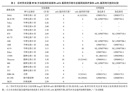 应用实时荧光定量PCR方法同时检测同一菌株同一浓度DNA的两个基因(bcsp31和orfA),每一菌株进行4次平行测定,获得CT值均值,按照公式n = ROUNDDOWN(POWER(2,(CTbcsp31 - CTorfA)/1))进行orfA基因的拷贝数换算,结果见表1。不同种与生物型的布鲁氏菌具有独特的orfA基因拷贝数,其中具有种与生物型区别的是羊种生物2型菌株,具有9个拷贝数,可与羊种生物1型(6个拷贝数)和3型菌株(7个拷贝数)鉴别;猪种生物2型菌株具有10个拷贝数,能够与其他4个猪种生物型菌株鉴别;绵羊附睾种菌株具有37个拷贝数;8个牛种生物型菌株拷贝数稳定在5~6个。同时,实时荧光定量PCR方法检测结果与全基因组测序结果比较,稳定性较好。见表2。