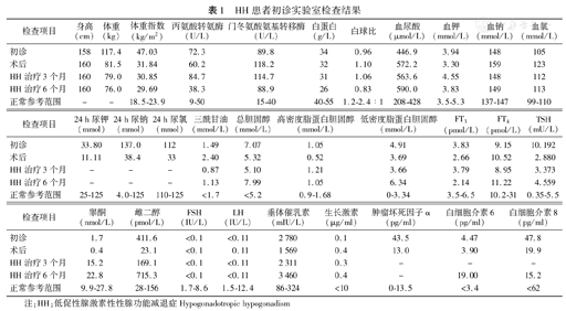 本文报道了1例男性HH合并重度肥胖的患者,在临床上实属罕见,且患者还存在多种垂体激素的异常及电解质紊乱,强烈提示存在下丘脑综合症。临床医生对存在重度肥胖的患者应注意筛查是否存在其他激素的异常,以免漏诊及误诊为单纯性肥胖。