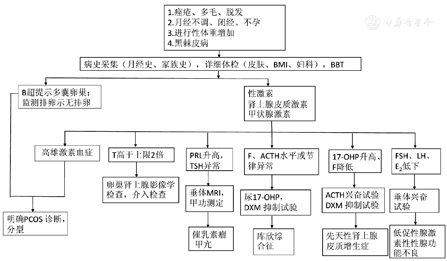 注:PCOS:多囊卵巢综合征;BMI:体重指数;BBT:基础体温;T:睾酮;PRL:催乳素;DXM:地塞米松;17-OHP:17羟孕酮;F:皮质醇