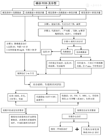 PCOS的治疗应围绕高雄激素血症、胰岛素抵抗、慢性低度的炎症状态这三个互为因果、相互促进的病理基础进行。但由于PCOS的临床异质性极强,肥胖型PCOS和非肥胖型PCOS的起病模式和发病机制并不完全一致,因此,PCOS的治疗应在基于对PCOS患者的综合评价(对于代谢轴和生殖轴的异常哪个占主导),再进行一个近期目标和远期目标的设定。而患者是否有生育要求,会对我们治疗方案的选择起到一个重要的影响。对有生育要求的患者,我们以在积极纠正其代谢异常的基础上达到其自行排卵或加用促排卵手段使患者达到排卵及获得正常的妊娠为治疗目的。对于暂时无生育要求的PCOS患者,治疗的近期目标为调节月经周期、治疗多毛和痤疮、控制体重;远期目标为预防糖尿病、保护子宫内膜,预防子宫内膜癌及心血管疾病。总之,进行个体化的综合生活方式干预及进行长期的随访观察是治疗PCOS患者总的治疗原则。