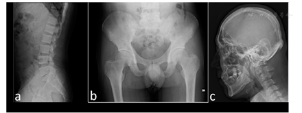 注:a:腰椎骨密度明显增加;b:骨盆骨质密度不均匀;c:头颅板障欠规则,骨质密度尚均匀