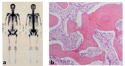 辅助检查:血常规:白细胞4.18×109/L,血红蛋白94 g/L,血小板189×109/L,网织红细胞2.45%;尿便常规正常;肝肾功能:丙氨酸转氨酶11 U/L,门冬氨酸氨基转移酶22 U/L,γ-谷氨酰胺转肽酶24 U/L,乳酸脱氢酶199 U/L(0~250),肌酐55 μmol/L,血钾4.2 mmol/L,血钠140 mmol/L;血沉38 mm/h,超敏C反应蛋白0.62 mg/L。骨代谢相关指标:血钙2.10 mmol/L(2.13~2.70),血磷0.88 mmol/L(0.81~1.45),ALP 1 366 U/L(45~125),血镁0.88 mmol/L(0.70~1.10),肌酸激酶49 U/L(24~195);24 h尿钙0.32 mmol,24 h尿磷16.38 mmol;PTH 144.0 pg/ml(12.0~65.0);β-CTX 4.61 ng/ml(0.26~0.51),25-(OH)维生素D3 12.7 ng/ml;骨密度(Z值):L1-L4为2.4,全髋为-0.6;X线片:部分胸腰椎椎体、骨盆骨质密度不均(图1);骨扫描:全身骨骼多发代谢摄取异常增强,呈"超级骨显像"(图2a)。