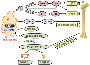 睾丸间质细胞的内分泌功能不完全依赖于睾酮的产生,INSL3是由睾丸间质细胞分泌的另一种特异性激素,也可作用于成骨细胞[22]。在男性的生命历程中,血清中INSL3水平随着性腺功能的改变呈现波动性的变化,自青春期开始逐渐升高,至性成熟期达到最高,衰老后性腺功能逐渐减退,血清INSL3水平也逐渐下降[11,23,24,25]。INSL3能刺激成骨细胞基因的表达,进而促进成骨细胞增殖和基质沉积相关蛋白合成,例如碱性磷酸酶(ALP)、COL1A1、COL6A1、骨粘连蛋白、骨桥蛋白和转化生长因子β(TGF-β)[2]。此外,INSL3还通过增加成骨细胞中M-CSF的表达间接刺激破骨细胞生成[2]。
