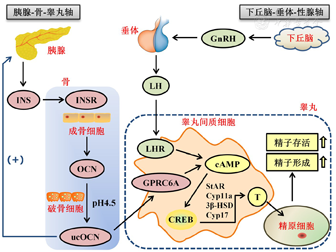 注:GnRH:促性腺激素释放激素Gonadotropin releasing hormone;LHR:LH受体LH receptor;INS:胰岛素Insulin;INSR:胰岛素受体Insulin receptor;OCN:骨钙素Osteocalcin;ucOCN:低羧化骨钙素Undercarboxylated osteocalcin;GPRC6A:G蛋白耦联受体C类6组A亚型G-protein coupled receptor, class C, group 6, subtype A;cAMP:环磷酸腺苷Cyclic adenosine monophosphate;CREB:环腺苷酸反应元件结合蛋白cAMP responsive element-binding protein;StAR:类固醇急性调节蛋白Steroidogenic acute regulatory protein;Cyp11a:胆固醇侧链裂解酶Cholesterol side-chain cleavage enzyme;3β-HSD:3β-羟类固醇脱氢酶3-β-hydroxysteroid dehydrogenase;Cyp17:17α-羟化酶Cytochrome P450 17α;T:睾酮Testosterone