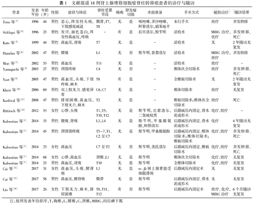 | Kaloostian等[1] | 2014 | 45 | 男性 | 颈背部疼痛 | T5~7,T1,C2至C7 | 无 | 是 | 酚苄明,甲基酪氨酸 | 后路减压内固定、椎体切除术;椎体切除术;椎板切除术 | 化疗,放疗 | 多发转移、死亡 |