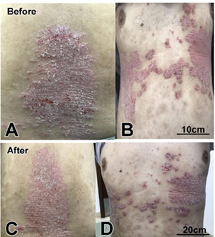 入院以后予以门冬胰岛素30皮下注射(根据患者血糖调整胰岛素剂量)、吡格列酮30 mg。在治疗11 d后,餐前血糖维持在6.3 mmol/L左右,餐后血糖维持在8.0 mmol/L,整个治疗期间未使用甲氨蝶呤、维A酸类、糖皮质激素以及紫外线照射等传统治疗手段治疗银屑病,然而患者的银屑病症状较前有所改善(图1)。