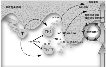 噻唑烷二酮在与PPARγ特异性结合后,通过调控细胞内多个炎症信号转导途径抑制免疫炎症反应[15]。PPARγ激活后能调节包括Th1和Th17细胞在内的各种效应T细胞分化[16]。而银屑病是以T淋巴细胞介导的免疫炎症性疾病。免疫T细胞(Th1、Th17)分泌的白细胞介素6(IL-6)、白细胞介素1β(IL-1β)、肿瘤坏死因子α(TNF-α)、白细胞介素23(IL-23)、INF-γ等炎症因子,在银屑病的发病机制中发挥着重要作用[1,2]。Th1细胞可产生INF-γ,TNF-α。核因子KB1(NF-KB1)能够诱导细胞程序性凋亡,并且控制了许多炎症基因的转录。而TNF-α能调节核因子KB1(NF-KB1)水平而抑制凋亡,从而导致表皮过度角化不全,并且TNF-α使得IL-6的生成增加,IL-6促进角质形成细胞的增殖[17,18]。TZDs通过激活PPARγ后直接与NF-KB1及p65/p50发生蛋白质-蛋白质相互作用形成转录抑制性复合物,降低NF-KB1与DNA结合的活性,阻断炎症因子的活化过程。同时激活后的PPARγ能够减少IL-1β、IL-6及TNF-α的产生[14,15]。Th17能产生IL-17、IL-21、IL-22、TNF-α等,并表达IL-23受体[1,19]。相关研究揭示了IL-23/Th17轴在促进银屑病的进展中起重要的作用[20]。已有的研究认为噻唑烷二酮作用于其靶分子PPARγ后,通过调节上述T细胞分化及相关炎症因子来治疗银屑病(图2)。