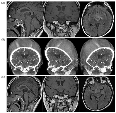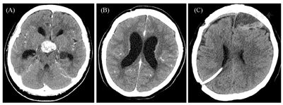 注:(A)、(B)术后脑积水改变;(C)脑室腹腔分流置管术后