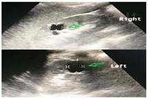 患者男性,30岁,以"多饮、多尿14年,肢体麻木1个月"入院。确诊糖尿病14年,一直予以"诺和灵50R"降糖,平素未监测血糖,亦未定期医院随访。患者已婚,已育1子1女,患者父母及子女无疾病表征。体格检查:身高173 cm,体重57 kg,体重指数(BMI)19.04 kg/m2。发育正常,体型偏瘦,肝脾肋下未触及,双肾区叩击痛阴性,四肢活动正常。辅助检查:随机静脉血糖23.0 mmol/L,血酮体阳性,二氧化碳结合力40.1,肾功能正常;肝功能:谷草转氨酶41.9 U/L(正常参考范围15~40 U/L,下同),血脂及电解质正常,HbA1C17.5%(4.8%~6%),尿白蛋白/肌酐比值(ACR)107.4 mg/g(0~30 mg/g),24 h尿蛋白定量0.15 g(0~0.5 g),甲状腺功能及相关抗体阴性,自身抗体全套阴性,C肽释放试验:空腹C肽0.17 pmol/L,30 min C肽0.13 pmol/L,60 min C肽0.17 pmol/L,120 min C肽0.14 pmol/L,180 min C肽0.20 pmol/L,胰岛素抗体阴性,抗谷氨酸脱羧酶抗体阴性。腹部及泌尿系彩超:双肾囊肿(图1)。眼科检查:双眼底未见明显渗出及出血。3个月后随访复查尿ACR 105.6 mg/g,HbA1C 9.3%,空腹指尖血糖波动在6.0~9.0 mmol/L,餐后2 h指尖血糖波动在9.0~10.0 mmol/L。