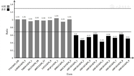 注:NGS数据分析,灰色部分为内参对照组,Ratio值=检测值/对照值;Ratio值在0.7以下怀疑缺失突变,1.3以上怀疑重复突变;患者HNF1B基因1~9号外显子Ratio值全部在0.7以下,提示杂合缺失