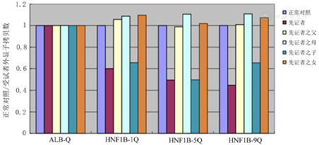 注:以ALB基因为内参基因,患者及患者之子HNF1B基因1-9外显子拷贝数与正常对照比值约为0.5,提示患者及患者之子HNF1B基因1-9外显子存在杂合缺失,患者父母及患者之女HNF1B基因1-9外显子拷贝数与正常对照比值约为1,提示患者父母及患者之女HNF1B基因1-9外显子拷贝数正常