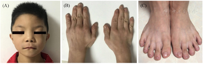 注:(A)面部特征,圆脸,眼距宽,上睑轻度下垂,鼻孔前倾,长人中,下唇下端横向折痕;(B)双手指短粗;(C)双脚趾呈球形