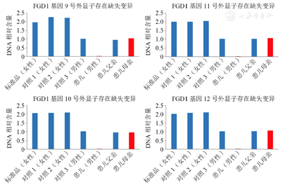 注:患儿FGD1基因9-12外显子脱氧核糖核酸(DNA)相对表达量低于其父及正常对照,其母表达量低于对照女性