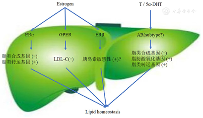 注:Estrogen:雌激素;ERα:雌激素受体α;GPER:G蛋白偶联受体;ERβ:雌激素受体β;LDL-C:低密度脂蛋白胆固醇;T:睾酮;5α-DHT:5α-双氢睾酮;AR:雄激素受体;subtype:亚型;Lipid homeostasis:脂类代谢